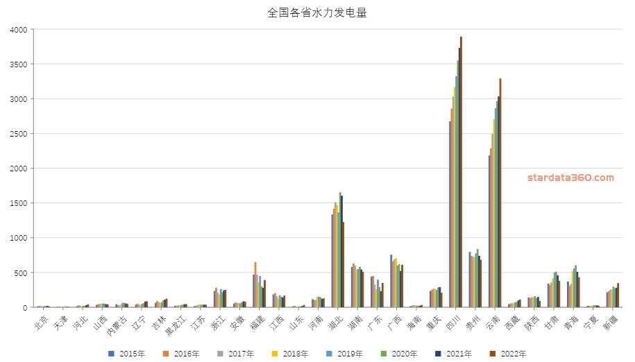 从图中我们可以很明显的看出水电装机容量排行靠前的为四川、云南、湖北
