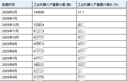 L 机器人 2016.01-2025.12全国工业机器人月度产量(附Excel下载) 最后更新:2026年4月13日 星源数据官方 本篇文章为大家介绍2016.01-2025.12全国工业机器人月度产量 全国,月度数据,共120个月 数据来源国家统计局 因统计局的统计规则,涉及春节,1月、2月合并统计所以只有1,2月份只有总和,没有单个月产量 2025全国工业机器人月度产量 Excel数据格式如下,购买后可下载完整数据 支付 ¥45 获取Excel地址(如遇问题 别慌~ 加客服微信:stardata888) 登录购买 OR 免登录购买 微信支付 如已付费购买,请 登录 或 免登录验证。