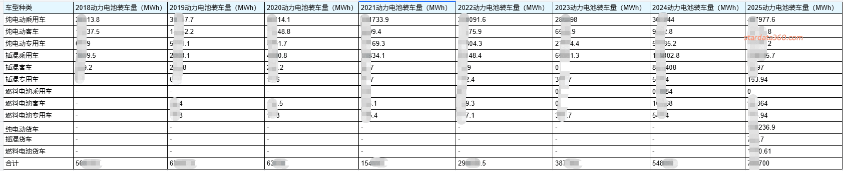 2018-2025不同车型动力电池装车量(附Excel下载)