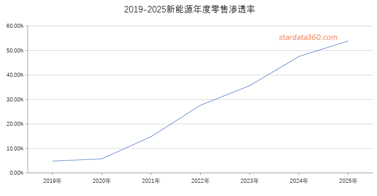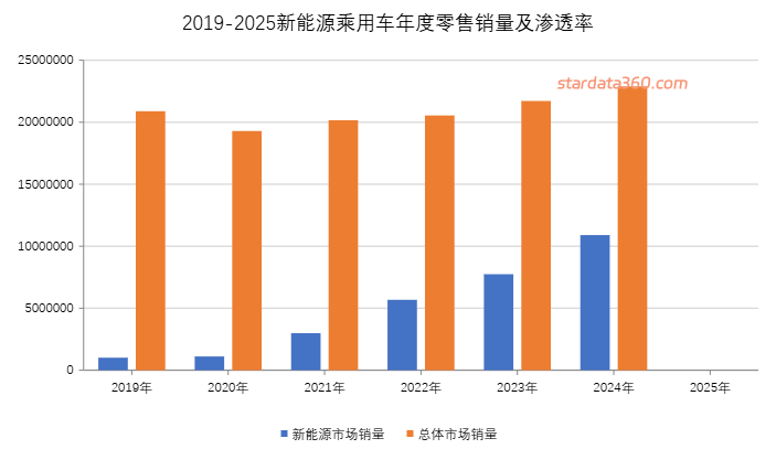 本篇文章为大家介绍2019-2025新能源年度零售销量与渗透率情况